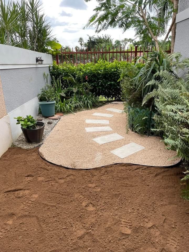 Caminos de gravilla decorativa, stepping stones, bordes y jardineras en concreto. Drenaje pensado desde el día uno para que no se hunda ni se cuartee en invierno.